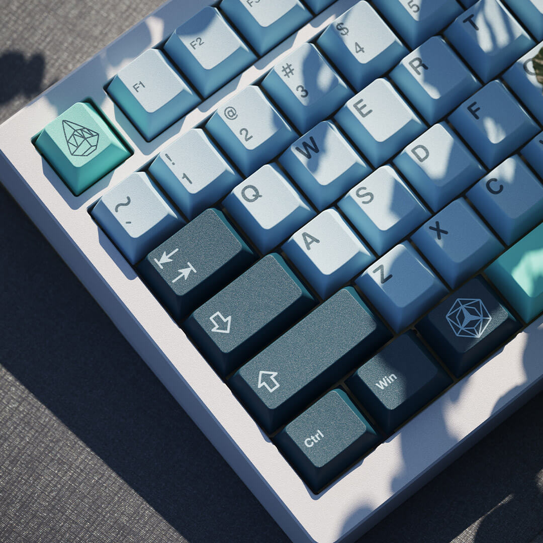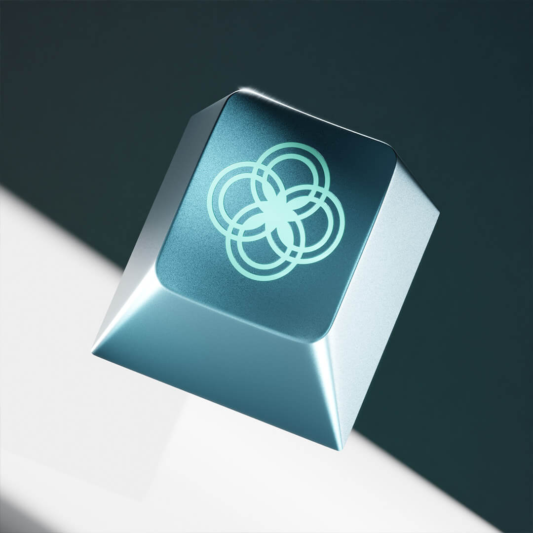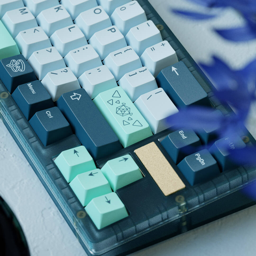 "Entwined Flowers is a keycap set inspired by Faruzan from Genshin Impact. She is one of my favorite characters and uses the power of Anemo to support her allies. I loved the soft blue, navy, and teal palette in her character design and the shapes she would craft when using her skills. I felt the colors would make for a sophisticated and elegant set of keycaps and I hope you enjoy them as much as I do."