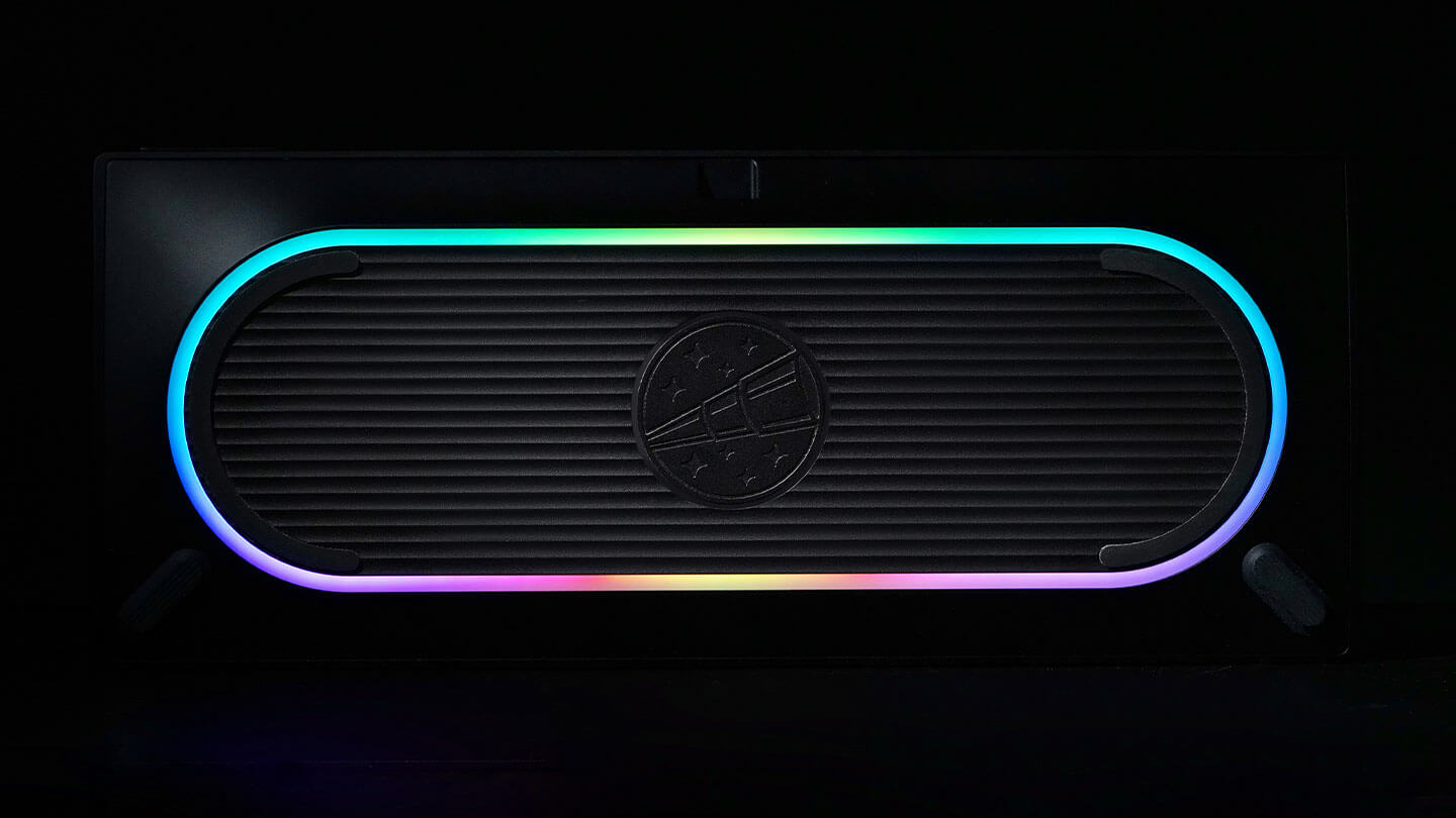 An RGB strip surrounds the racetrack curved weight. When lit, the light appears to emanate organically from within, lighting up the surrounding. The MX PCBs also feature per-key RGB.