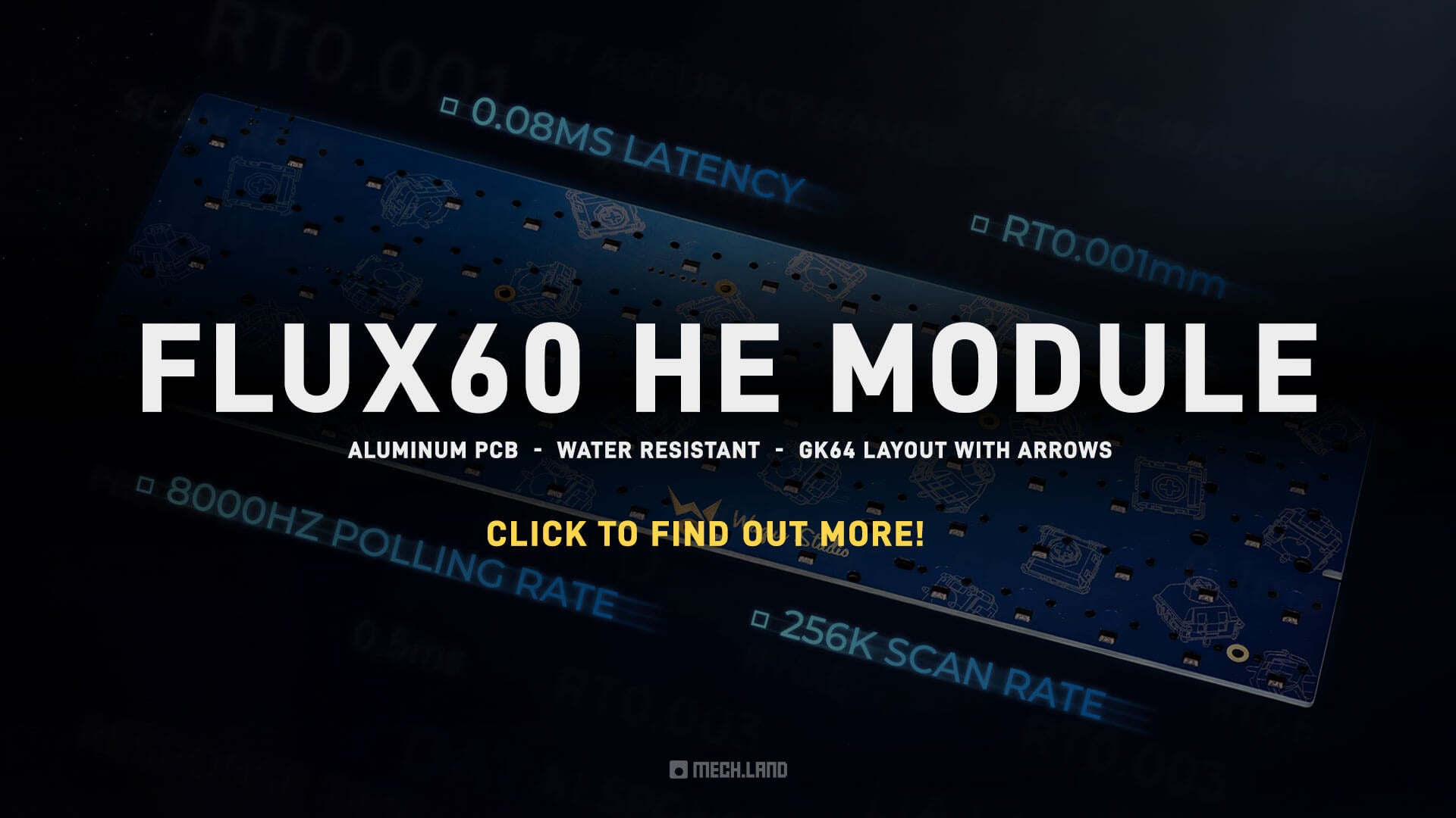 Add the Flux60 HE module to your order to switch between a traditional MX or a high performance HE setup anytime! The PCB is made of Aluminum for maximum heat dissipation, and comes with a water-resistant coat for the occasional accidental spill! Click on the image to find out more!