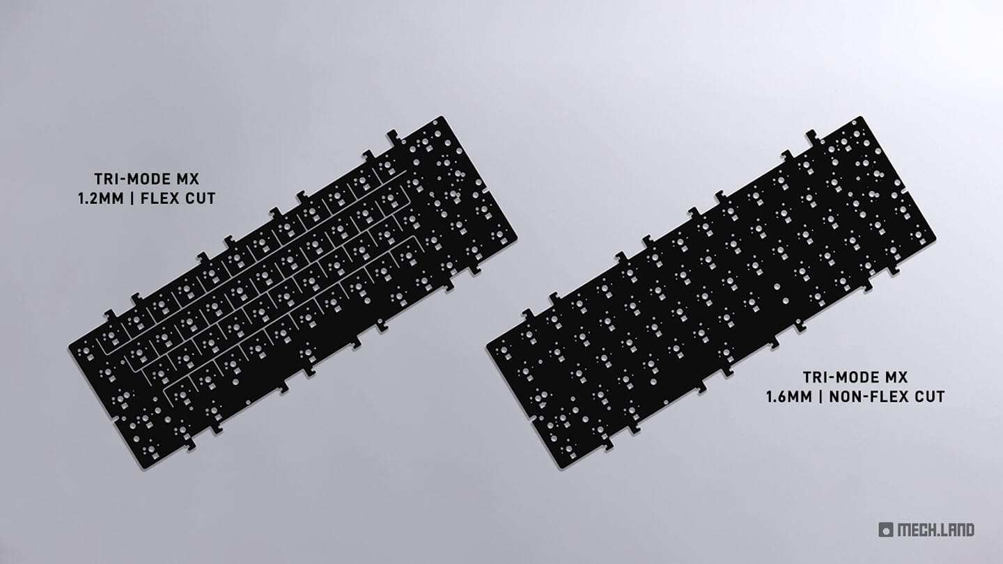 Each Barebones Kit comes with an MX PCB of your choice. Choose the 1.2mm Flex Cut PCB for a bouncier typefeel, or choose the 1.6mm Non-flex cut option for a more rigid typing experience!