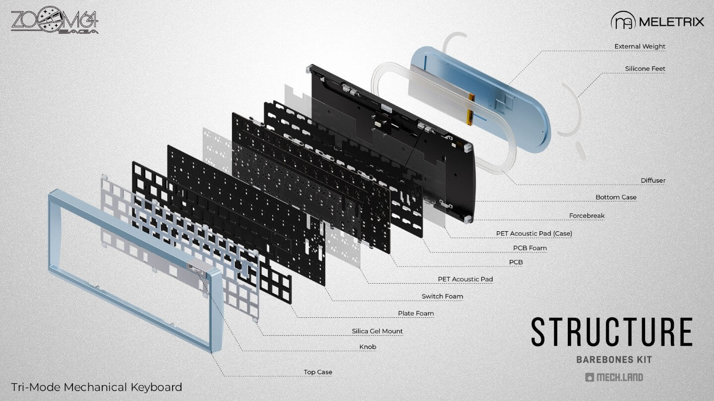 -The Barebones Kit is similar to all the other Zoom keyboards released to date. It comes with everything you need, except for switches and keycaps. It comes with a standard MX or mechanical switch compatible PCB.