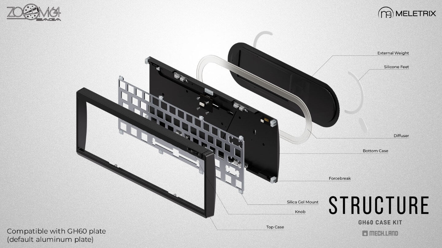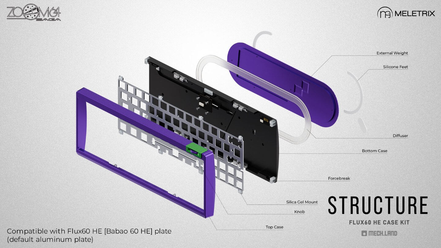 With case kits, you are not limited to just the default MX PCBs! Bring your own GH60 compatible MX or HE PCBs like the Wooting 60HE PCB, or use a Flux60 / Babao60 HE PCB to enjoy the beautiful design and the knob of Zoom64!